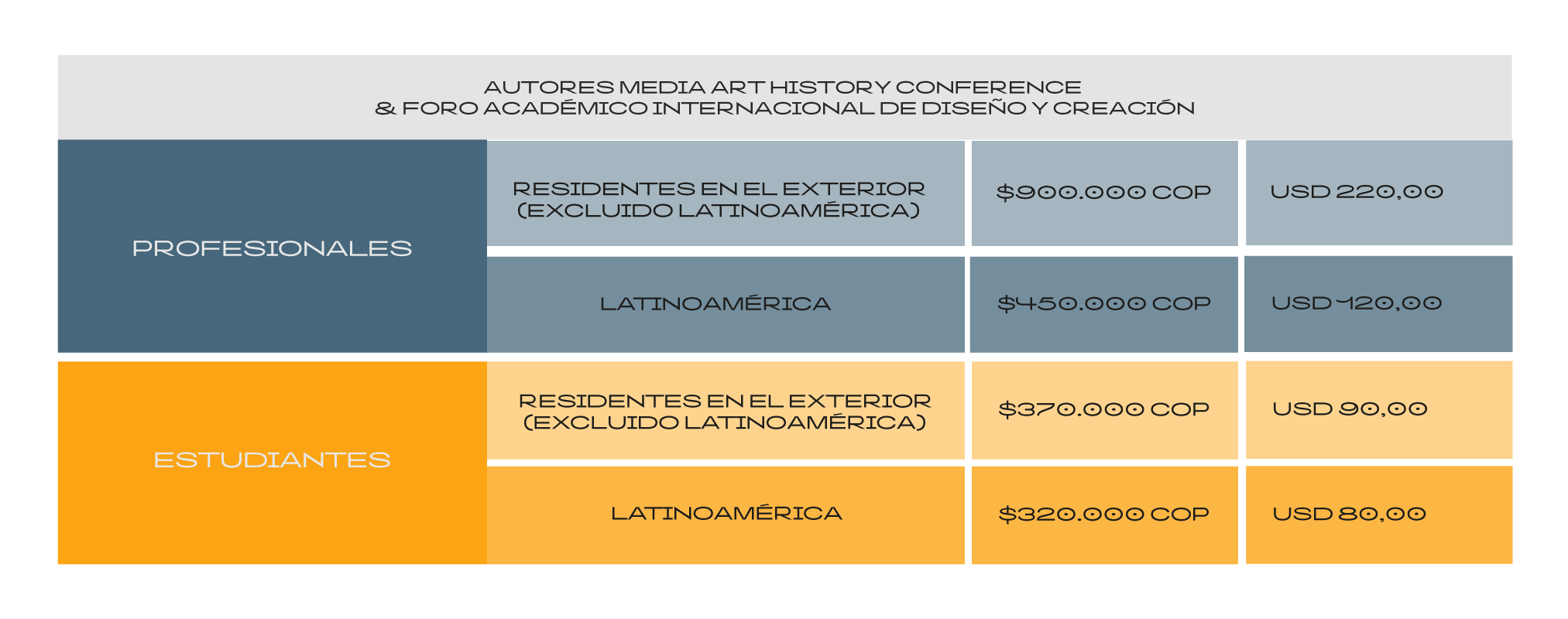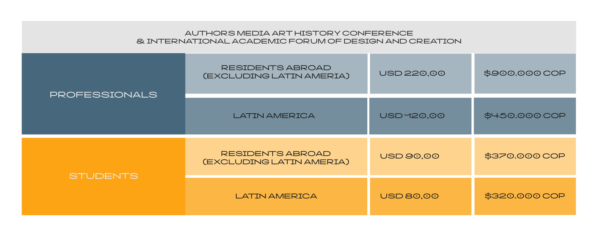 Los estudiantes de Doctorado en Diseño y Creación y Maestría en Diseño y Creación Interactiva de la Universidad de Caldas y del Doctorado en Diseño de la Universidad Jorge Tadeo Lozano de Bogotá, pagan con tarifa de estudiantes. Si son ponentes, deben pagar la tarifa de ponentes en modalidad estudiante.