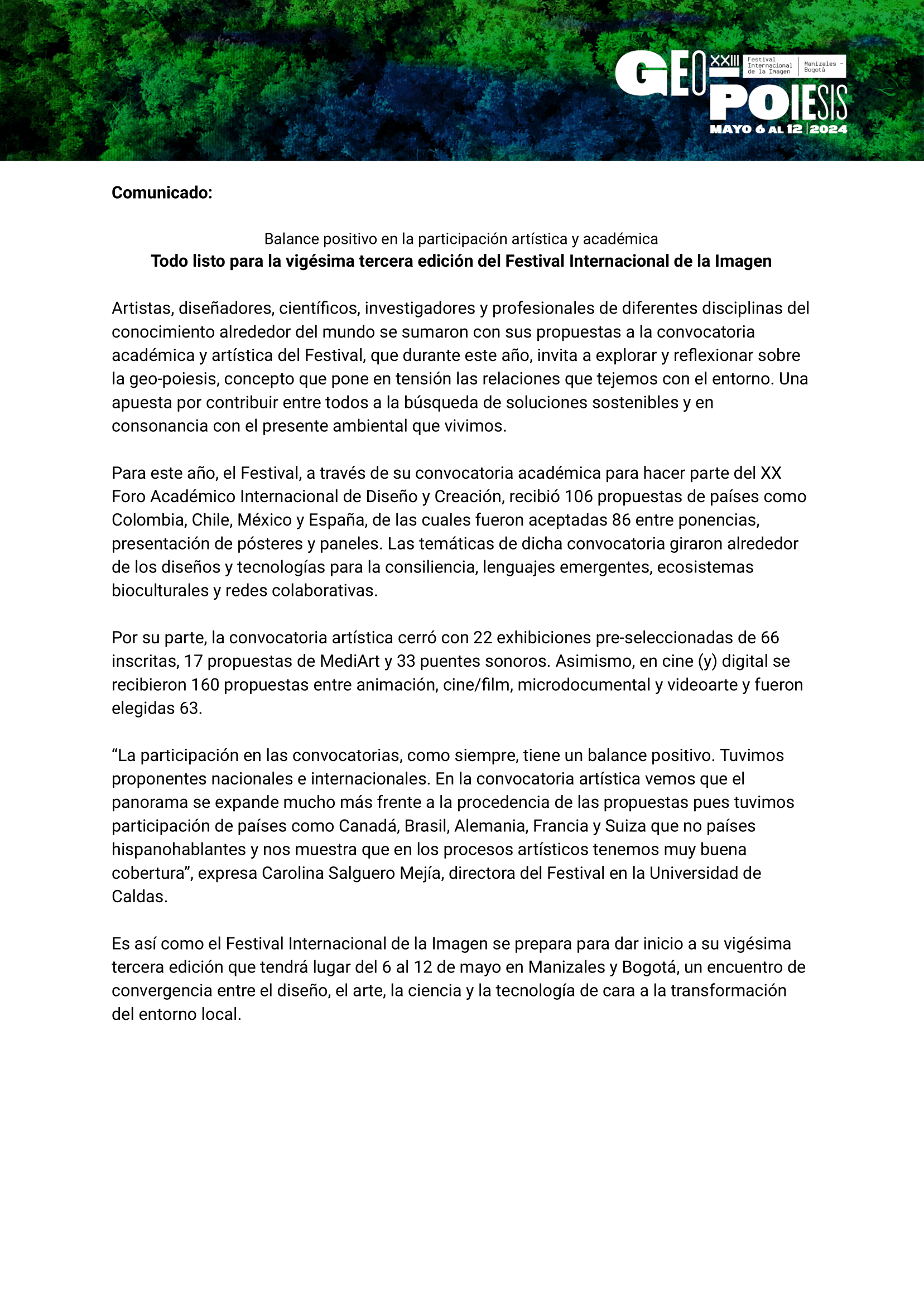 XXI International Image Festival – SURtropías Manizales-Bogotá Colombia October 17 to 21, 2022 The Curatorial and Academic Committee of the International Image Festival 2022, is allowed to inform the selection of the proposals to participate in the following categories: Academic Call XVIII International Academic Forum. Artistic Call. interactions. IX Design, electronic art and technology market. Thanks to the outstanding participation of researchers, teachers, students, artists and professionals in the areas of design, art, science and technology, we will have the opportunity to meet to discuss from the idea of Surtropía, emerging concepts that, beyond the geopolitical borders, allow exploration to be directed towards alternative forms of critical and propositional analysis of various realities, in order to thus contribute to the social appropriation of knowledge and continue to be an academic reference in Colombia and Latin America. 1. Pre-selected Academic Call XVIII International Academic Forum The participants […]