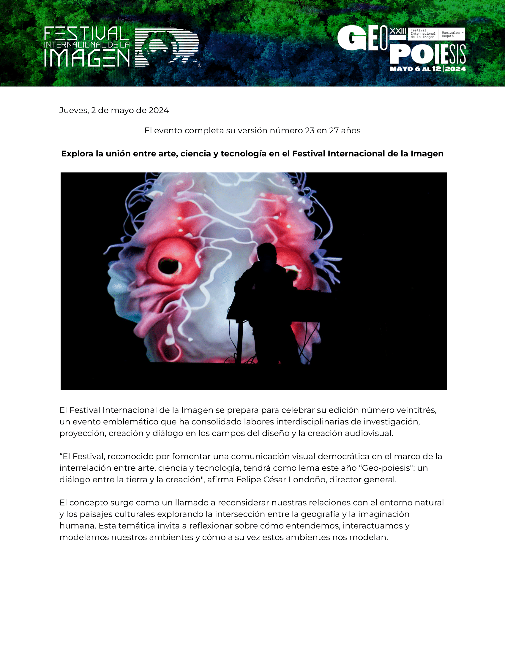Academics, researchers, professionals, teachers, and undergraduate and graduate students from all over the country will be able to apply with ideas and projects to the ImagenFest academic call that will be open until March 31, 2023. Those selected will participate in one of the cultural events most representative digital and electronic arts in Latin America, which this year will take place from May 29 to June 4 in Manizales and Bogotá.