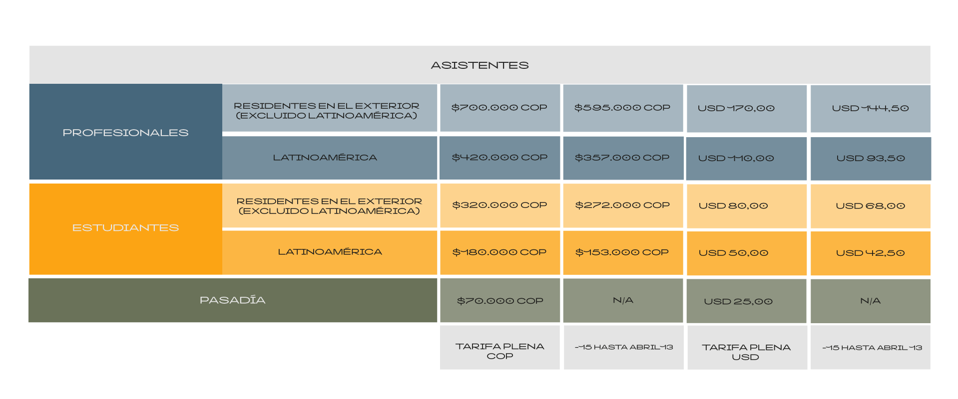 Las tarifas de inscripción se basan en la fecha de recepción del pago (no en la fecha de inscripción). Todos los precios están expresados en dólares americanos y pesos colombianos.
