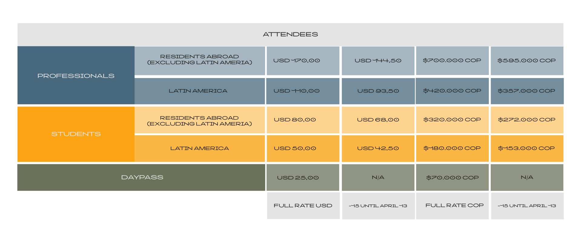 Registration fees are based on the date of payment receipt (not the registration date). All prices are expressed in US dollars and Colombian pesos.